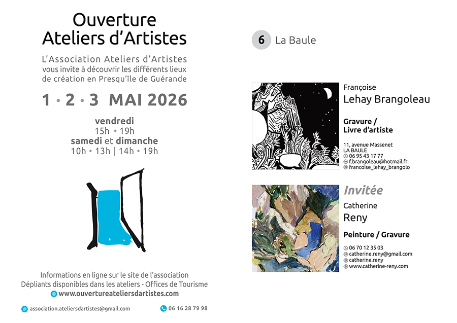 Participation à cet évènement en tant qu’artiste invitée par Françoise Lehay Brangoleau dans son atelier de La Baule les 1er, 2 et 3 mai 2026. Évènement organisé par l’Association Ouverture Ateliers d’Artistes.